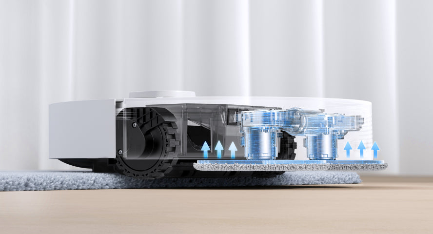 * Podnoszenie mopa na wysokość 10,5 mm: różnica w wysokości automatycznego odkurzacza przed i po podniesieniu mopów wynosi 10,5 mm. W przypadku dywanów o włosiu dłuższym niż 3 mm zalecamy ustawienie robota za pośrednictwem aplikacji do sprzątania na omijanie dywanów o włosiu średnim i długim (opcja dostępna tylko w trybie inteligentnego czyszczenia dywanów), co pozwoli zabezpieczyć dywany przed zamoczeniem.** Podwójne czyszczenie dywanów: tylko w trybie intensywnego czyszczenia dywanów.