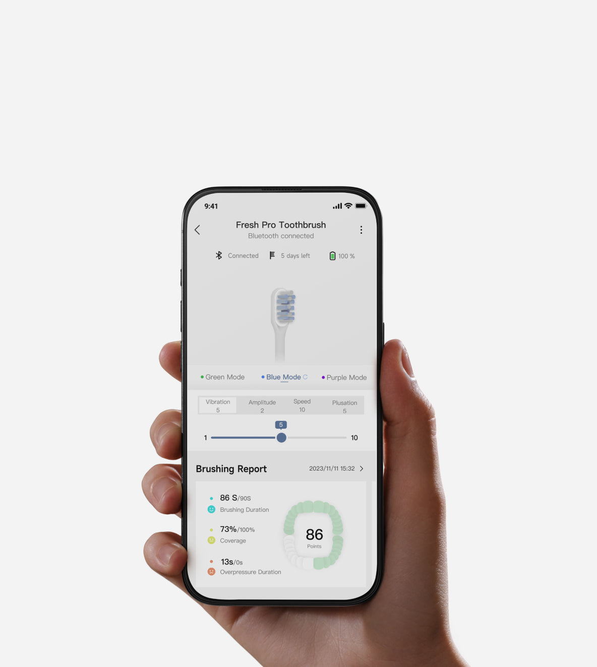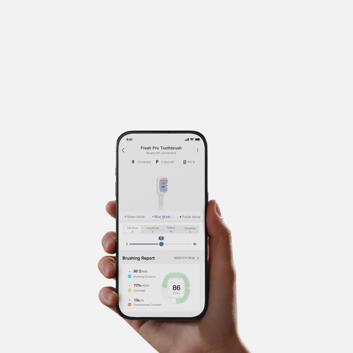 Periuța electrică echipată cu tehnologia inovatoare 3DClean™* integrează atât motoare servo, cât și motoare pas cu pas pentru un control precis și eficient. Modelul Fresh Pro combină vibrațiile sonice cu mișcări riguroase de periaj în direcțiile sus-jos și stânga-dreapta, asigurând o curățare profundă și completă a întregii cavități bucale, cu un efort minim din partea ta.