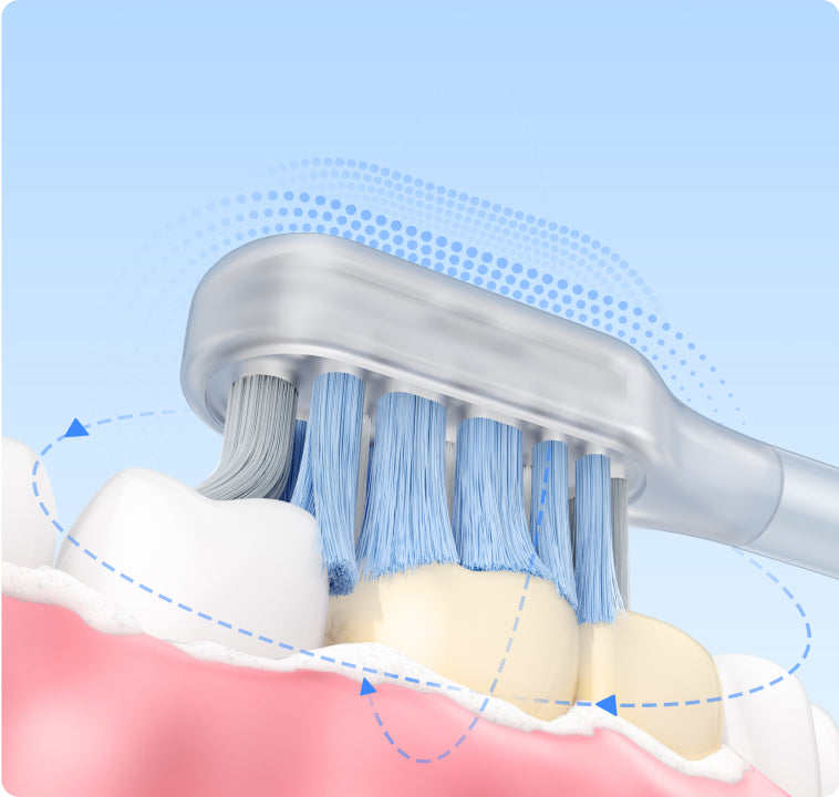 Perii extinși ajung până la dinții din spate și pătrund la doar 0,01 mm* între dinți și gingii, în timp ce perii conturați care înconjoară dinții curăță eficient șanțul gingival.