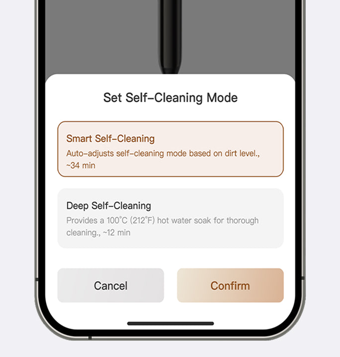 Selectează modurile de autocurățare, programează autocurățarea temporizată și monitorizează progresul în timp real.