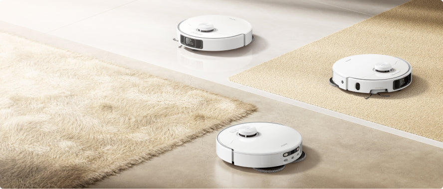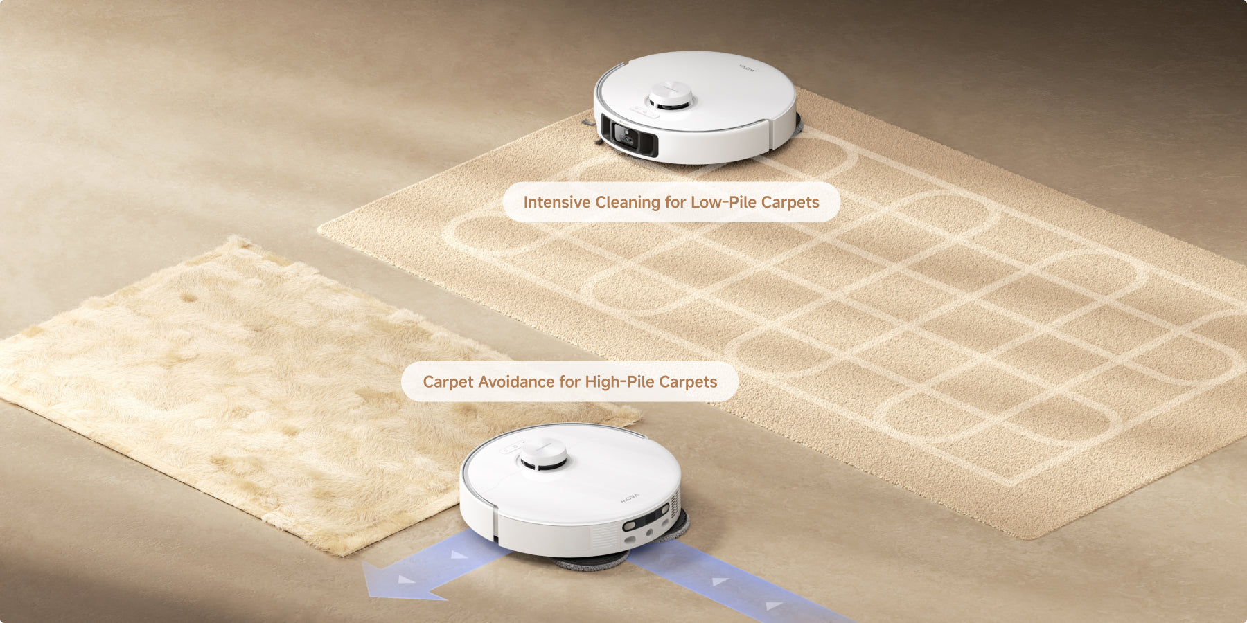 * 10,5 mm (0,41 in.): diferența de înălțime a aspiratorului robot este de 10,5 mm (0,41 in.) înainte și după ridicarea mopurilor. Pentru covoarele cu fibre mai lungi de 3 mm (0,12 in.), îți sugerăm să setezi aspiratorul robot să evite covoarele cu fibre medii și lungi din aplicația de curățare, protejând covoarele împotriva udării.