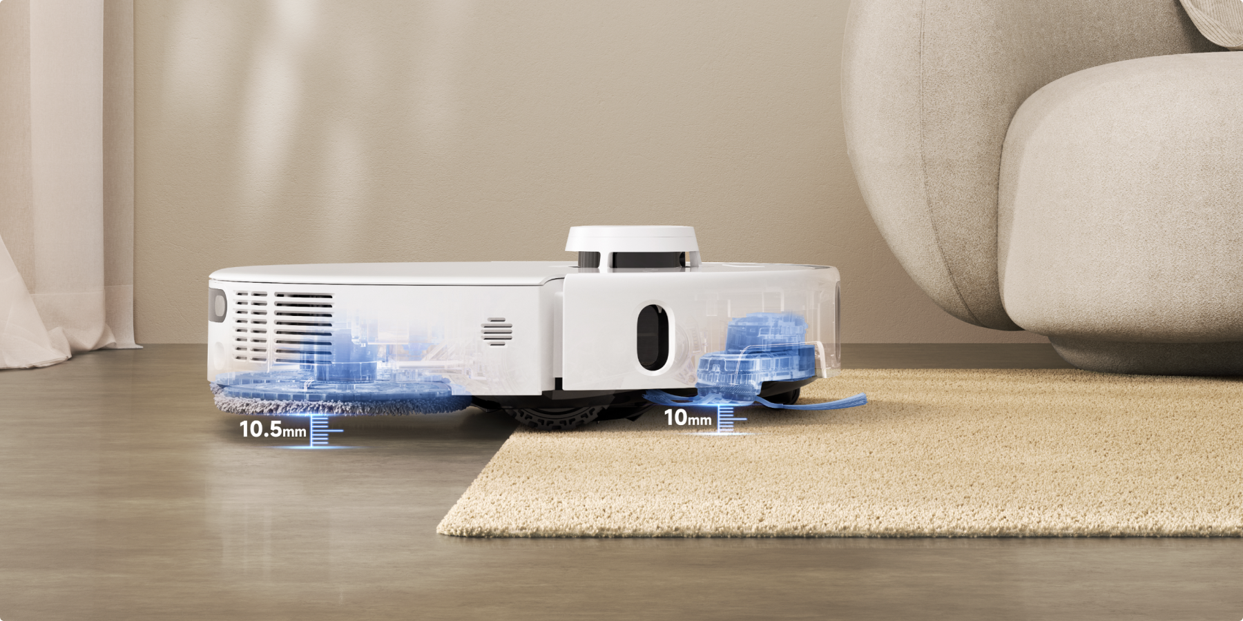 Beneficiază de o navigare ușoară în fiecare cameră cu P50 Ultra. Acest aspirator robot trece peste praguri cu o înălțime de până la 22 mm (0,86 in.), abordând eficient pragurile din baie și evitând obstacolele de zi cu zi, cum ar fi haine, pantofi și altele.