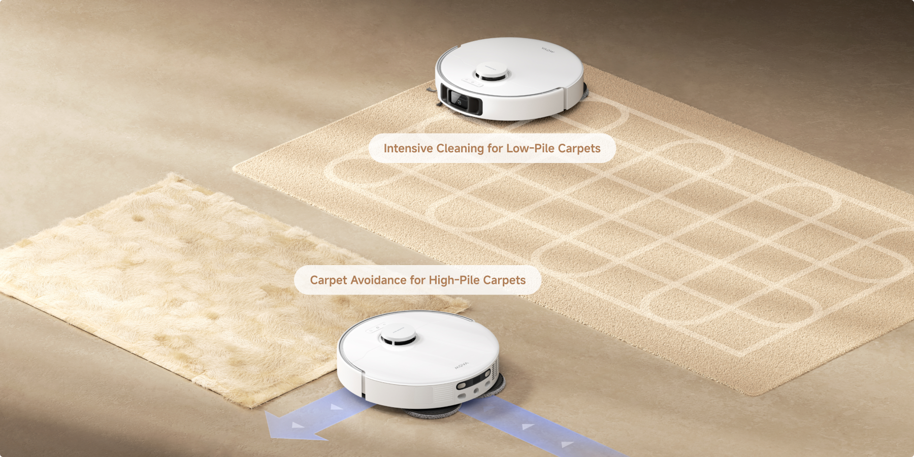 * Pentru covoarele cu fibre mai lungi de 3 mm (0,12 in.), îți sugerăm să setezi aspiratorul robot să evite covoarele cu fibre medii și lungi din aplicația de curățare, protejând covoarele împotriva udării.