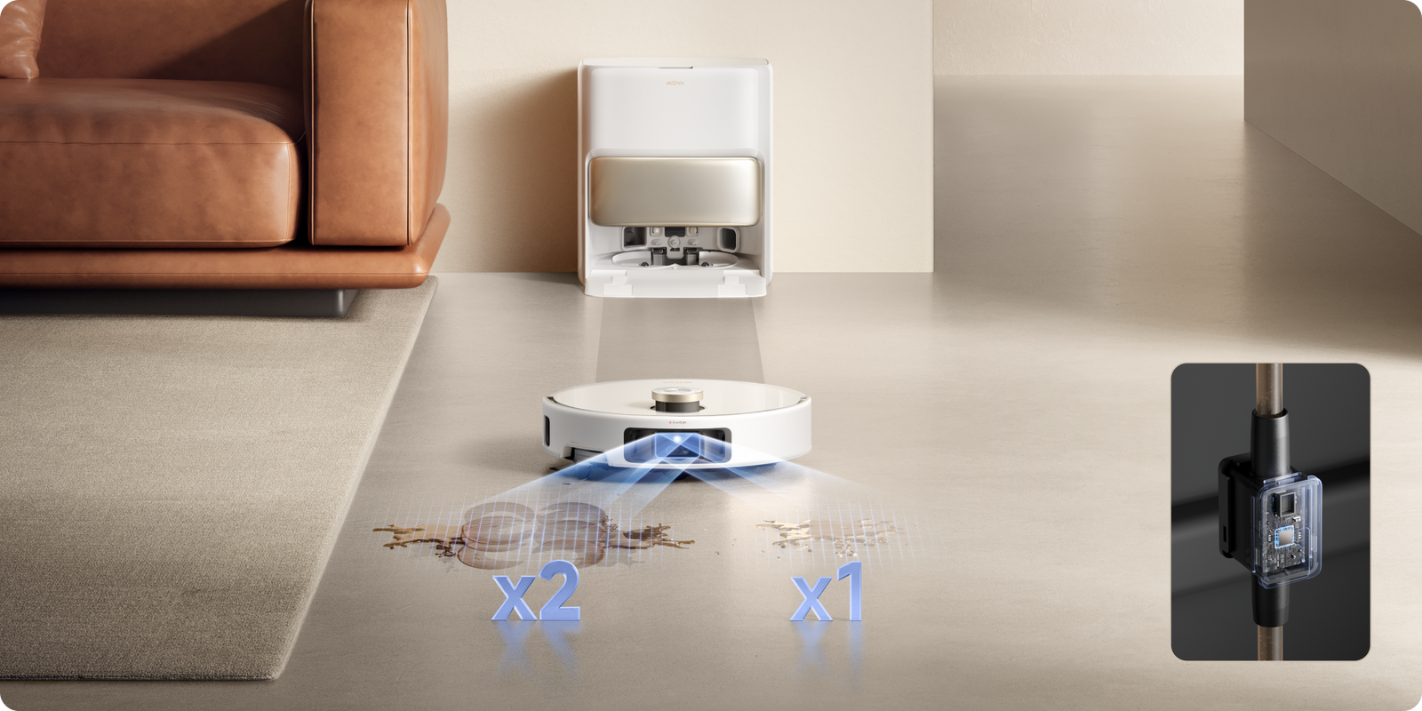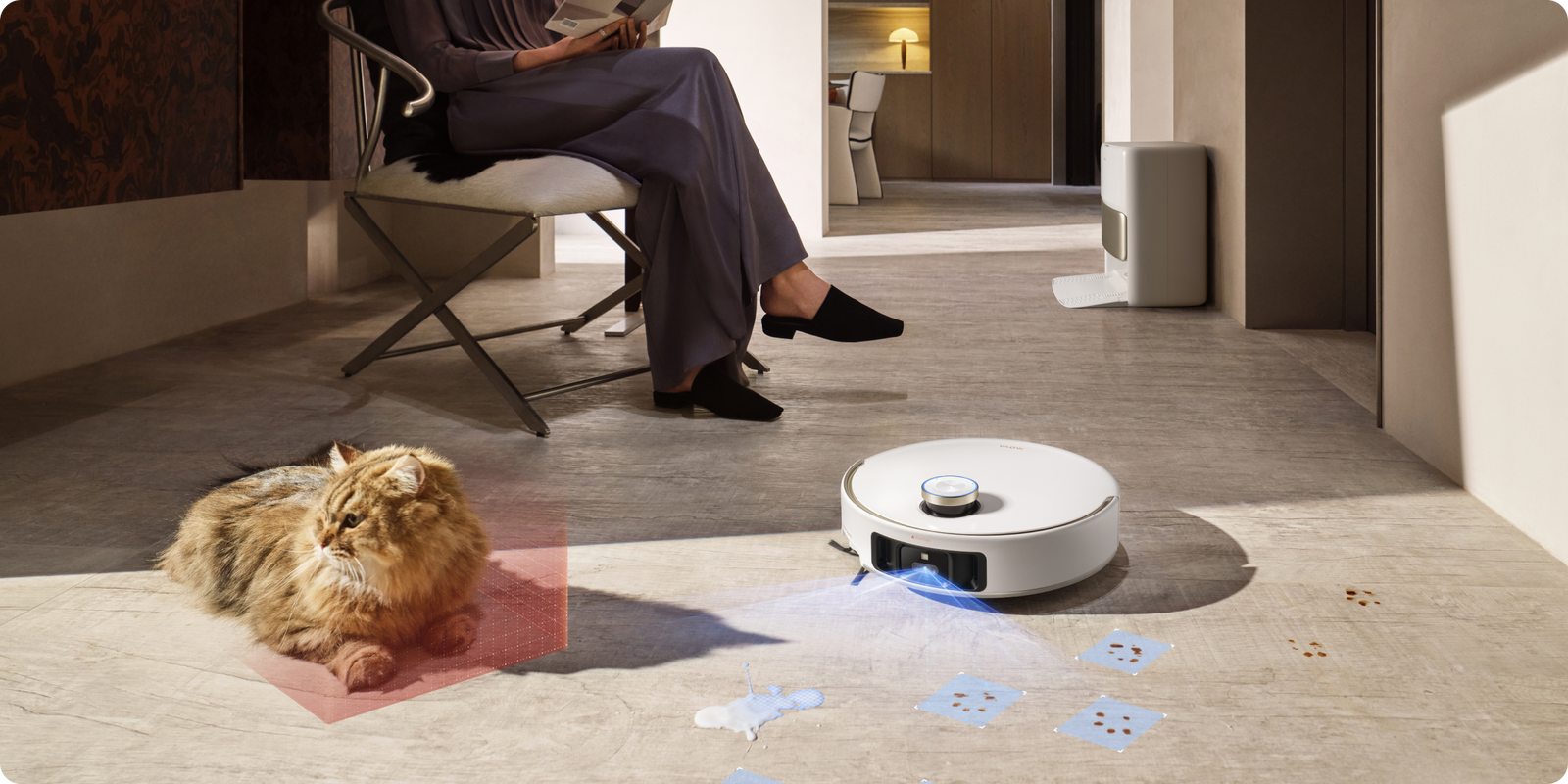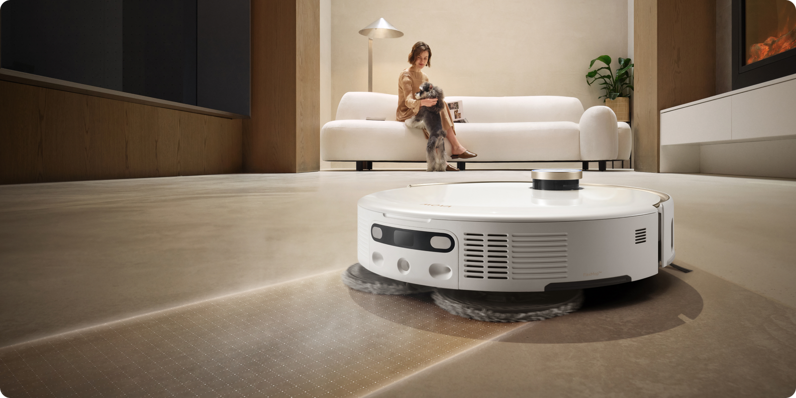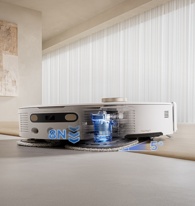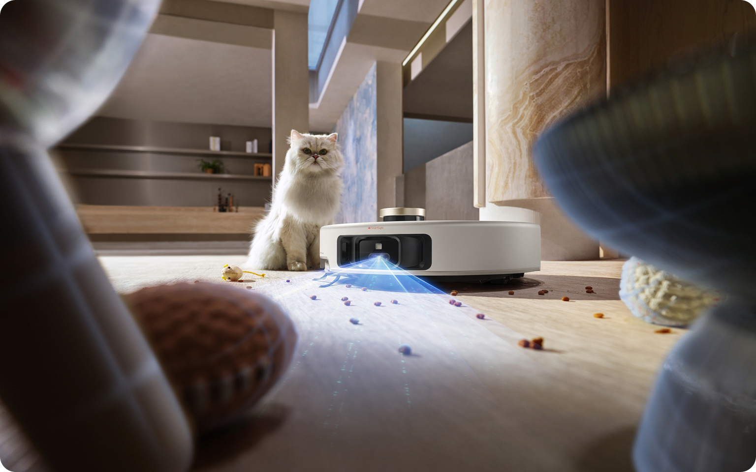 Sistemul StepMaster™ dispune de picioare robotizate retractabile care pot ridica șasiul, permițându-i să treacă ușor peste trepte, praguri, șine de uși, picioare de mobilier în formă de U și obstacole mici de până la 6cm* înălțime. Navighează cu ușurință în medii complexe de acasă pentru o curățare temeinică și întoarcere fără efort.