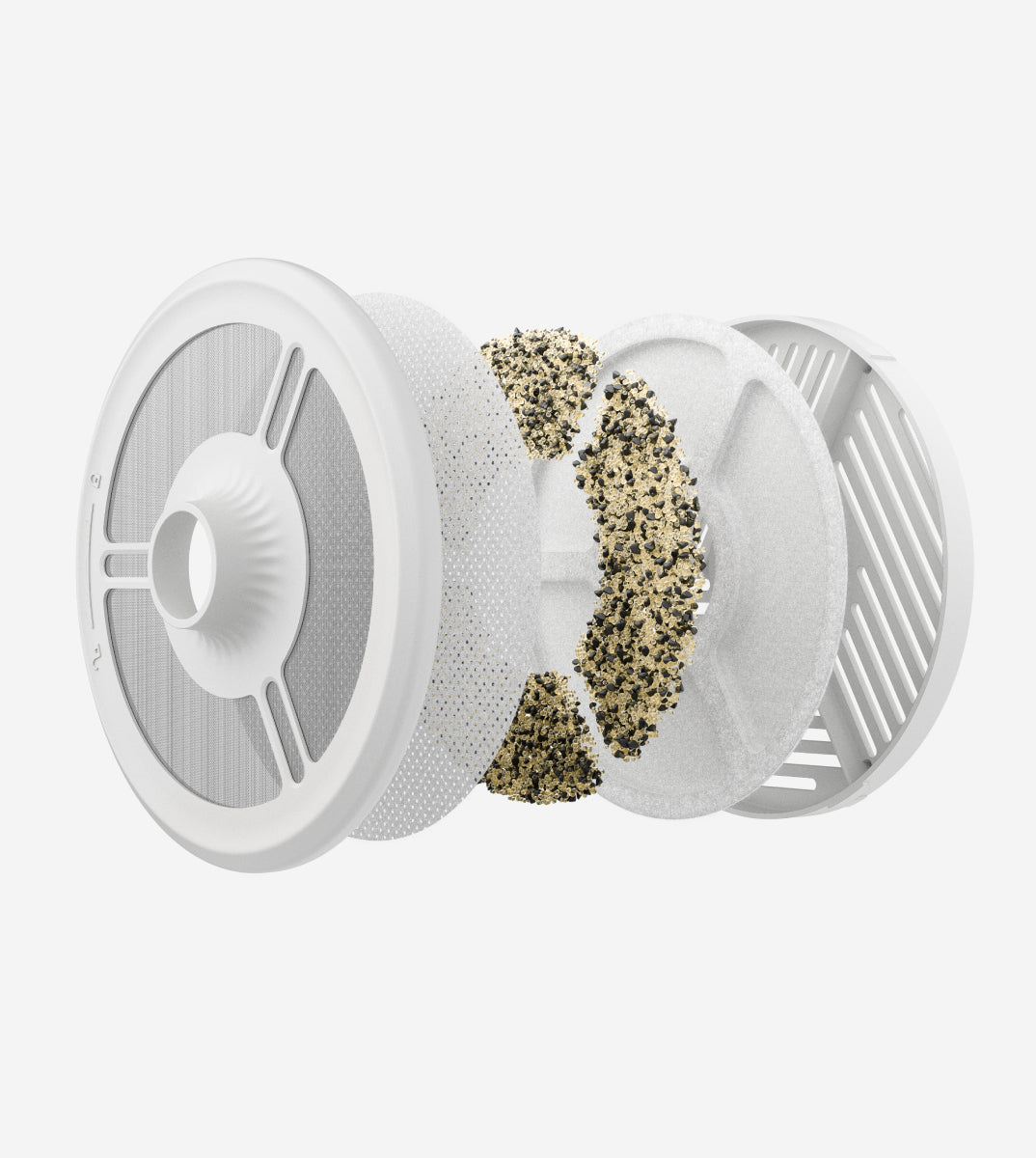 Păstrează apa de băut curată datorită filtrului în 4 straturi (sită din oțel inoxidabil, material netesut, rășină cu schimb de ioni și cărbune activ), care captează praful, părul, mirosurile și alte impurități.
